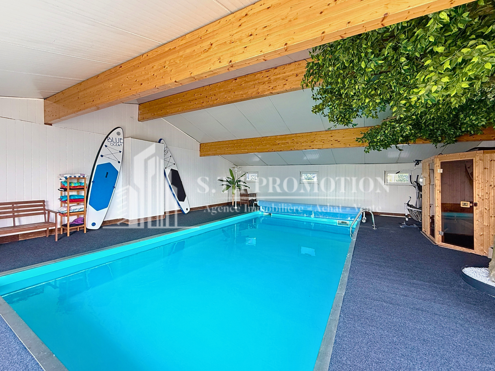 Le bien dispose d’un espace bien-être privé avec piscine intérieure chauffée (10x5 m), sauna, et hammam : un luxe rare à savourer toute l’année.